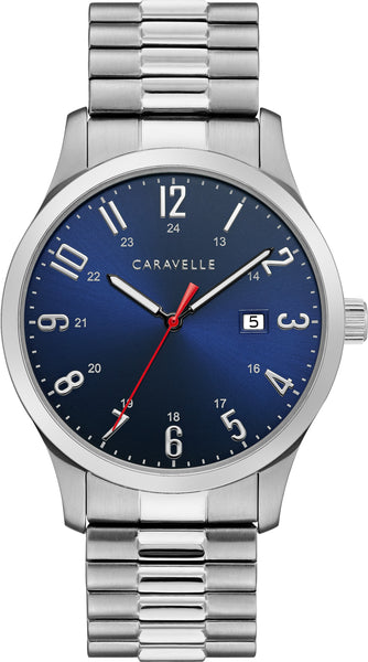 Timeless design, wear-with-everything style. Three-hand date feature and easy-to-read numerals with bold 24-hour design on dark blue dial accented with metallic indexes. Stainless steel case and comfort-fix expansion bracelet.
