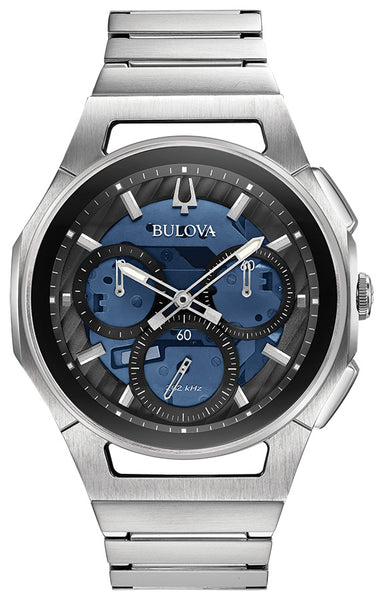 From the CURV Collection. The world s first curved chronograph movement features high-performance quartz technology with 262 kHz vibrational frequency for precise accuracy. Five-hand chronograph in stainless steel with dark blue dial with silver-tone hands and markers, exhibition case back, anti-reflective curved sapphire glass, screw-back case, stainless steel bracelet with double-press deployant closure, and water resistance to 30 metres. Calibre: NR20