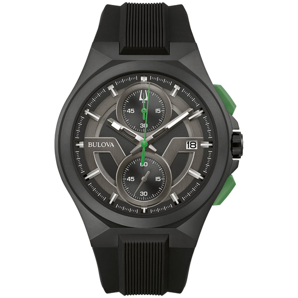 Make a bold statement with the sporty, new Maquina timepiece – guaranteed to stand out on any wrist. The modern design with a rugged edge features a black ion-plated stainless steel case and dark grey and black dial with green accents that showcases the 5-hand chronograph movement and calendar on a matte black silicone strap. It also features a sapphire crystal and water resistance to 100 metres. This distinctive men’s Maquina watch offers a new twist on a bold chronograph that is essential for your sport style. Calibre: 6S11