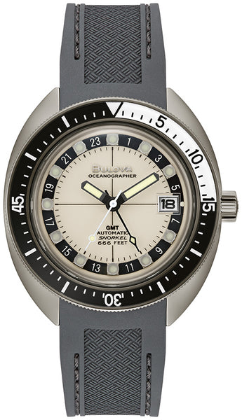 For the uncompromising thrill seeker, there is no alternative to this all-new Bulova men’s Oceanographer GMT. The perfectly sized 41mm stainless steel case features a grey IP coating, a screw-down crown that provides 200 metres of water resistance, and a unidirectional rotating black-and-white timing bezel. Under the box sapphire crystal, the fully luminescent white dial features a black 24-hours scale and minute markers, applied round luminescent hour markers, and a date display. The bold handset features luminescent fill for exceptional low-light legibility, and an independently adjusted hour hand that allows you to quickly set the local time. The Oceanographer GMT is powered by a self-winding GMT movement with 24-jewels and a power reserve of 42 hours, protected by a screw-down caseback. Paired perfectly with a fitted black silicone strap with a rugged three-piece buckle. When you need a timepiece that can go everywhere you want and never fall behind, the men’s Bulova Oceanographer GMT is the only option. Calibre: 9075