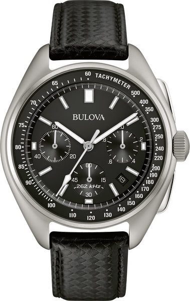 After Apollo 15’s mission commander made lunar history—while wearing his personal Bulova chronograph—we’re making history again. The Bulova Moon Watch replicates that original timepiece, updated with our exclusive high performance quartz movement with a frequency of 262 kHz for unparalleled accuracy, continuing a history of precision timing. In stainless steel screw-back case in silver-tone finish and black dial, sapphire glass, and interchangeable black leather and nylon straps with three-piece buckle closure, and water resistance to 50 metres. Calibre: NP20