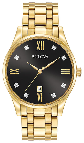 From the Diamonds Collection. New 8-diamond black dial, gold-tone stainless steel case and bracelet with double-press deployant closure, three-hand calendar, flat mineral glass, and water resistance to 30 metres. Calibre: 9U13