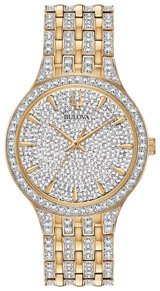 New slim and sleek style embellished with 636 crystals. This gold-tone stainless steel case and bracelet watch features a mineral crystal, quartz movement, and water resistance to 30 metres. Calibre: GL36