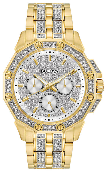 From the Men’s Crystals Collection. Gold-tone stainless steel case embellished with 306 crystals on bezel, bracelet and pavé dial, multifunction movement, gold-tone stainless bracelet with deployant closure, and water resistance to 30 metres. Calibre: 6P79