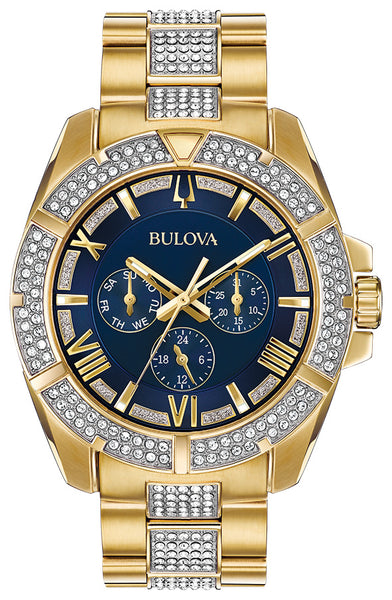 From the Crystals Collection. In gold-tone stainless steel. Embellished with 318 crystals on bezel, blue dial and bracelet, six-hand multi-feature movement, luminous hands and markers, mineral glass, gold-tone stainless bracelet with deployant closure, and water resistance to 30 metres. Calibre: 6P29