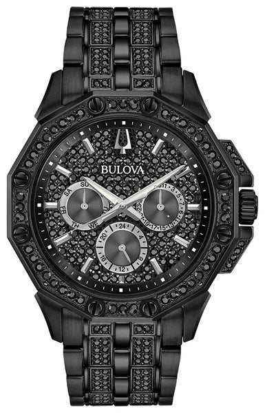 Multi-function dress watch boldly embellished with 300 crystals on the black-tone stainless steel case and bracelet with a pave set black dial. Water resistance to 30 metres. Calibre: 6P79
