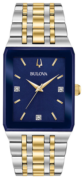 Introducing a new tank style. Silver-tone stainless steel case with edge-to-edge blue faceted metalizing mineral crystal and gold-tone crown. Blue dial with three diamonds set on dial. Water resistance to 30 metres. Calibre: 2036