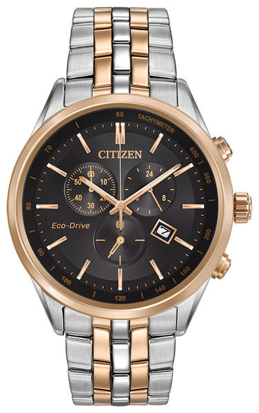 CITIZEN® offers a touch of sophistication to your watch collection with this dress chronograph featuring sapphire crystal. This handsome watch is shown in two-tone rose gold-tone stainless steel with a black dial. Additional characteristics include a 1-second chronograph measuring up to 60 minutes, 12/24-hour time, and date. Water resistant up to 100 metres.