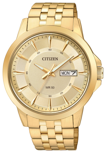 This CITIZEN® Quartz timepiece features a gold-tone stainless steel case and bracelet with a champagne dial. It is complete with a day/date function and luminous hands and markers.