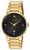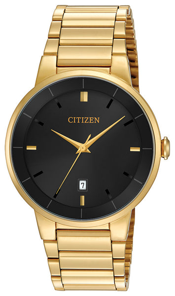 This CITIZEN® Quartz timepiece features a gold-tone stainless steel case and bracelet with a black dial and date.