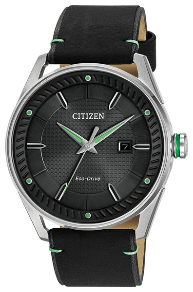 Check this out! The fresh design of this CTO timepiece from CITIZEN®'s DRIVE collection gives a modern look to a simple and classic style - perfect for the millennials of today. Shown in a stainless steel case with a black dial and matching leather strap, this timepiece highlighted by green accents features a screw-back case and date display. Water resistant up to 100 metres.