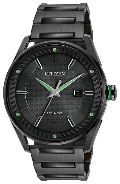Check this out! The fresh design of this CTO timepiece from CITIZEN®'s DRIVE collection gives a modern look to a simple and classic style - perfect for the millennials of today. Shown in a black ion plated stainless case and bracelet with a matching black dial, this timepiece highlighted by green accents features a screw-back case and date display. Water resistant up to 100 metres.