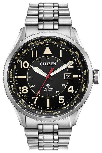 Revamped and reinvented, the antique styled CITIZEN® Avion is here to stay. Features include world time in 26 time zones, perpetual calendar, anti-shock and date. Shown here in a stainless steel case and bracelet with black dial. Featuring our Eco-Drive technology – powered by light, any light. Never needs a battery.