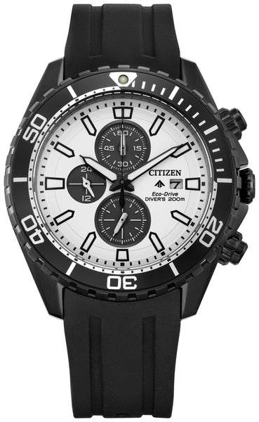A stylish new update to the Promaster Dive Collection, featuring a stainless steel case and black polyurethane strap with a white dial, a black unidirectional bezel and luminous hands and markers, this must-have dive watch also includes a 1/5 second chronograph measuring up to 60 minutes, 12/24-hour time and date function. Sustainably powered by any light with Eco-Drive technology that never needs a battery, you’ll wear this sporty men’s timepiece in style from office meetings to ocean adventures. Water resistant to 200 metres. Calibre B612.
