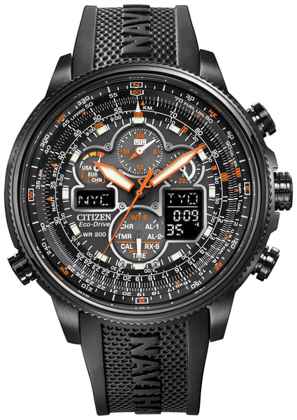 Go where the wind takes you with the Navihawk A-T. With Atomic Clock synchronization for superior accuracy, this perpetual calendar chronograph is radio-controlled with world time in 43 cities. This sporty timepiece has a black ion plated stainless steel case and a polyurethane bracelet with a black dial and is water resistant to 200 metres. Additional features include a 1/100-second chronograph that measures up to 24 hours, 99-minute countdown timer, 2 alarms, digital backlight display, universal coordinated time (UTC) display, power reserve indicator, and pilot's rotating slide rule dial ring.